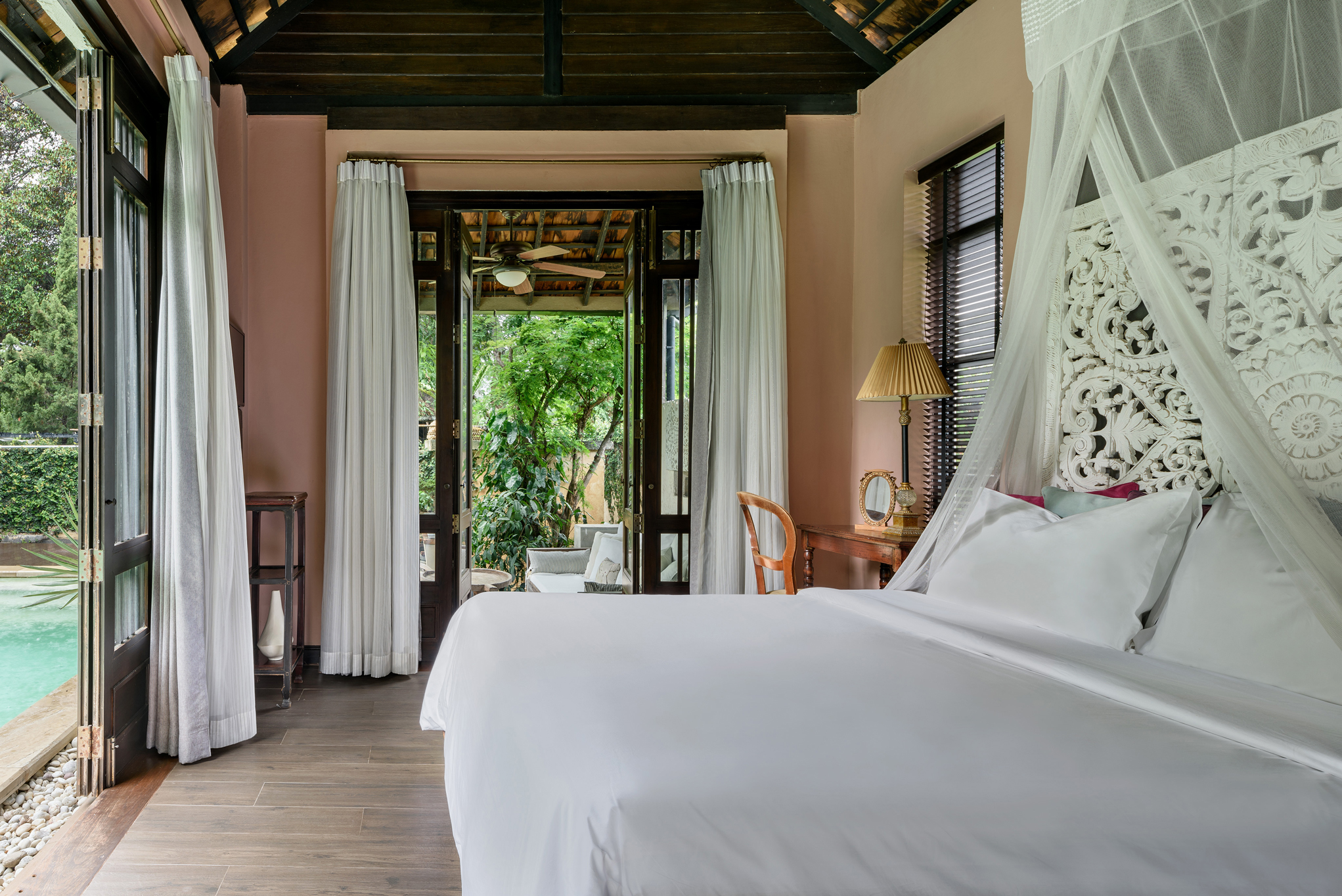 Lighting around the plants creates a unique effect on the walls and ceiling, while the dark colored wall behind the bed defines the transition from bedroom to nursery.